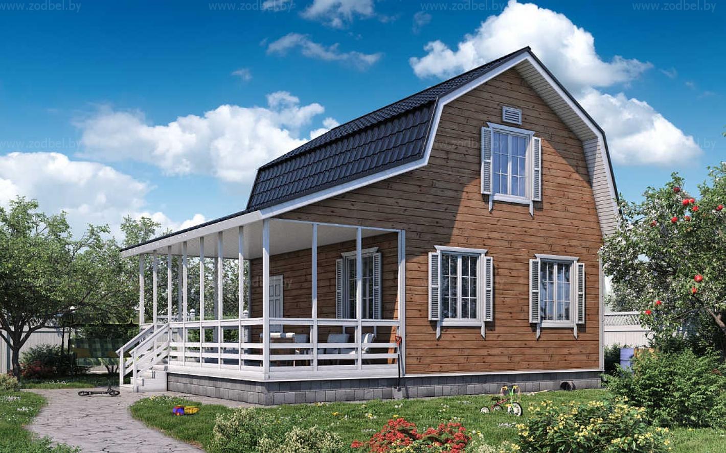 Этот дом построен из клееного бруса толщиной 140мм. На первом этаже имеется прихожая и три комнаты. Одна может стать кухней-столовой, вторая небольшим залом, третья – комнатой отдыха для гостей. На втором этаже расположены две комнаты – спальня и детская. Кроме этого, имеются ещё два варианта планировки. Разница между ними заключается в возможности варьировать метраж комнат по желанию заказчика. «Зодчий» готов построить Вам дом с ломаной или с традиционной крышей.