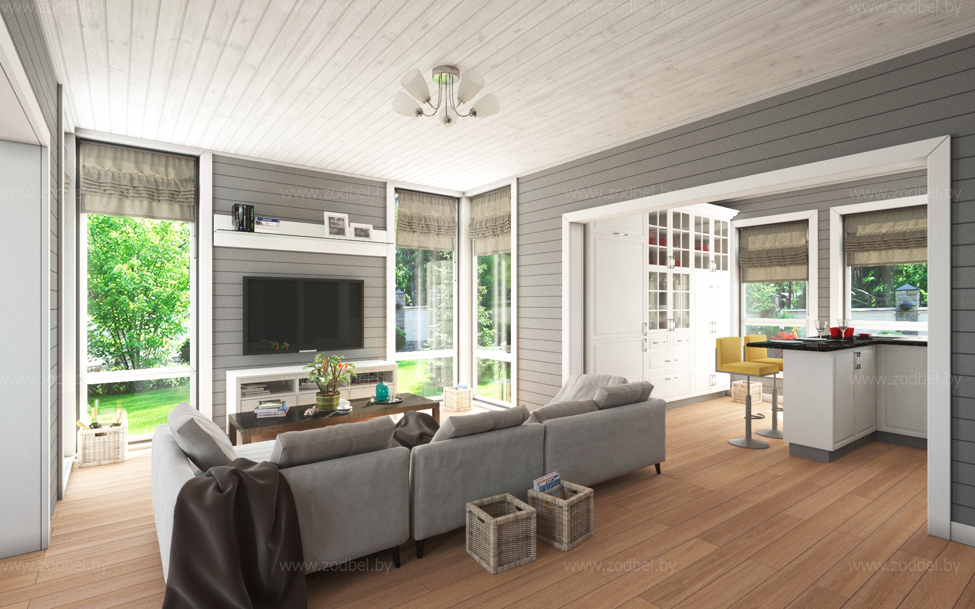 Согласно фасадам Стойки бруса естественной влажности выполняется ограждение. Настил пола террасная доска (сосна) с зазором 6 мм Отделка потолка: обрешетка из п/м 20, шаг 250 мм. |